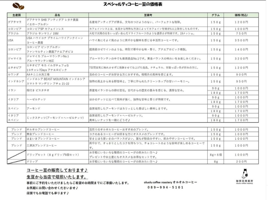 スペシャルティ珈琲豆の価格表を更新しました😊他にはない、こだわりの豆を沢山揃えております。四国で取り扱いの少ない稀少な製法の豆もあります❤️