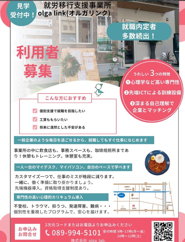 利用者募集 就労移行支援 2024.05.27 オープンして1年半が経緯しました👏1期生の皆さまの就職や内定が続出しております。MOS資格認定会場で合格率100%,満点合格も続出している事業所です💯 公務員、金融機関、福祉施設、皆さんが夢を叶える場所❤️ 完全個別支援が特徴です😊定着支援や楽しいOB・OG会🎉 一緒に自己実現を目指したい方、三津で一歩!olga linkからつながろう! いつでもご見学にお越しくださいませ♡ \ 最新情報をチェック / FacebookXBlueskyHatenaPocketCopy