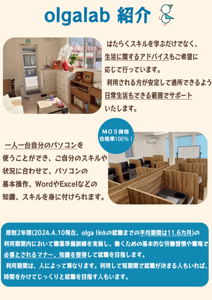 松山市の「自立」や「一般就労」を目指して知識習得のための勉強や職業訓練を行う就労移行支援施設です。個別支援と交流のバランスを重視した空間。安心できる、繋がれる、居心地の良い中で成長でき、障がいや疾患だけを見るのではなく、その人の個性を如何に伸ばし「自立」と「定着」に向けたプログラムを行います。
